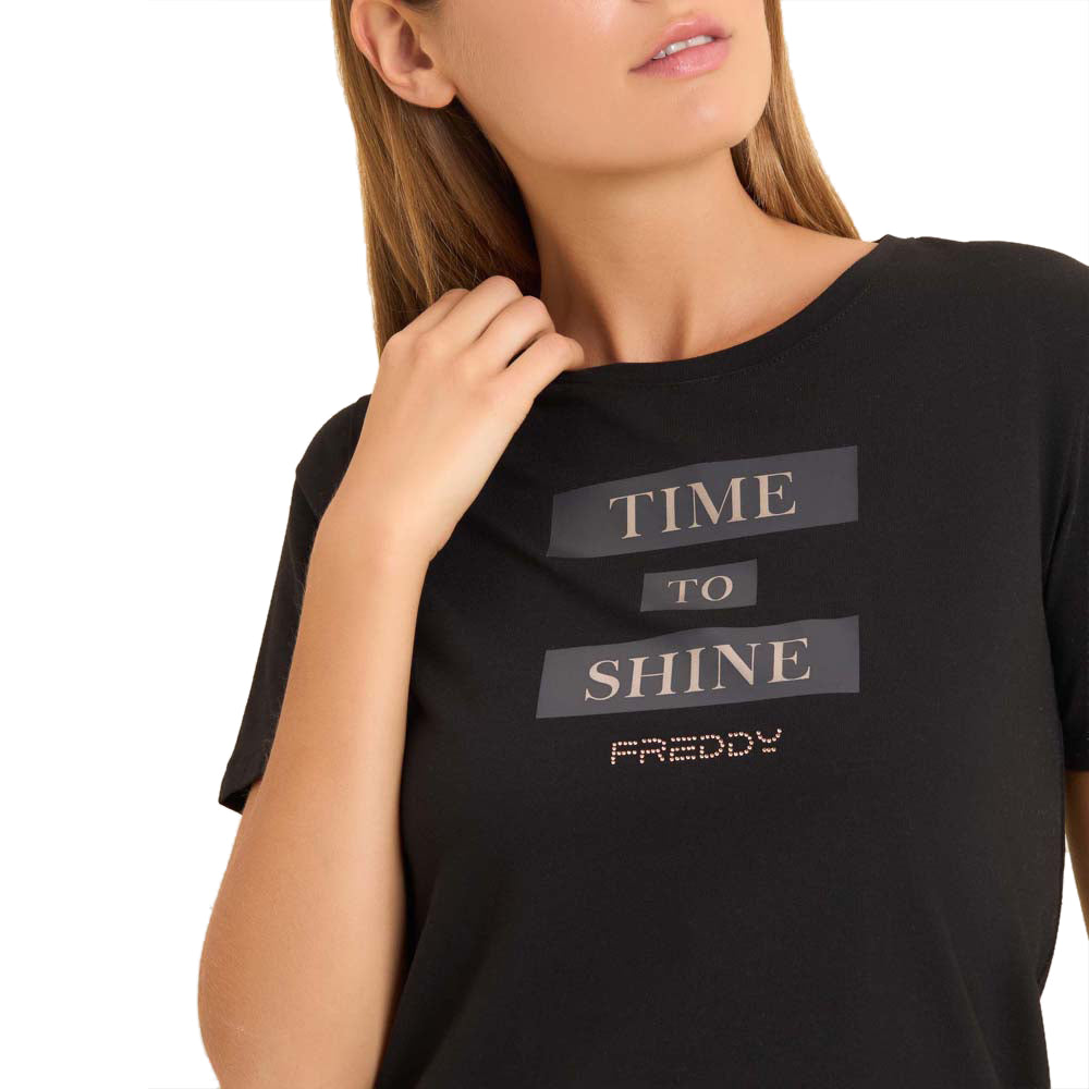 Freddy T-Shirt Donna - Un must-have nero che unisce stile e comfort. Perfetta per esaltare la tua personalità, donando un tocco di eleganza casual ad ogni outfit. Ideale per la donna moderna e dinamica. Qualità Freddy garantita.SKU: